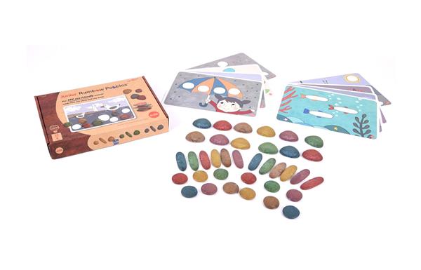 De eco regenboog stenen zijn gemaakt van natuurlijke materialen (FPC). Een agrarisch afvalproduct van rijststengels en rijstkaf. Elke kiezelsteen heeft zijn eigen unieke natuurlijke korrel en de dubbelzijdige opdrachtkaarten zijn ontworpen in natuurlijke kleurtinten die bij de kiezelstenen passen. Ideaal voor het ontwikkelen van fijne motoriek, tellen en sorteren en creatief ontwerp. FPC heeft de volgende ecologische voordelen: Breekt af in de omgeving Geen vervuiling - minder energie- en waterverbruik bij de productie Volledig recycleerbaar