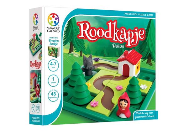 Vind de weg naar grootmoeders huis. Er was eens… Ontdek de magie van het populaire sprookje in dit originele denkspel speciaal voor de allerkleinsten. Kan jij Roodkapje helpen om de weg naar Grootmoeders huis te vinden? Zet Roodkapje, grootmoeders huis en de bomen op het spelbord en gebruik de puzzelstukken om een weg van Roodkapje naar het huis te maken. Kan je alle 24 opdrachten oplossen? Je kan het spel ook spelen met de wolf erbij, maar let op want hij zal eerst bij het huis zijn! Probeer deze 24 andere opdrachten op te lossen door twee wegen naar het huis te maken, één voor Roodkapje en één voor de wolf. Roodkapje bestaat uit 48 opdrachten (24 met de wolf en 24 zonder) en bevat ook een leuk prentenboekje met het originele sprookje in een eigentijds jasje.