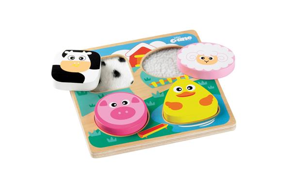 Voel het wollige lammetje en de gevederde eend... Verwijder de houten puzzelstukken om verschillende materialen met de juiste textuur onder de dieren te ontdekken. Een geweldige manier om de zintuigen te stimuleren.