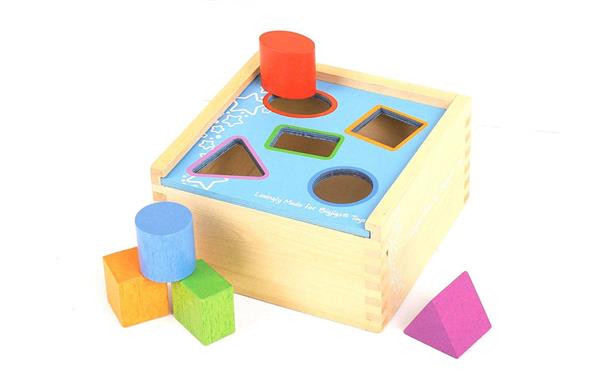 Mooie houten kleurrijke vormen sorteerbox met 5 verschillende vormen.